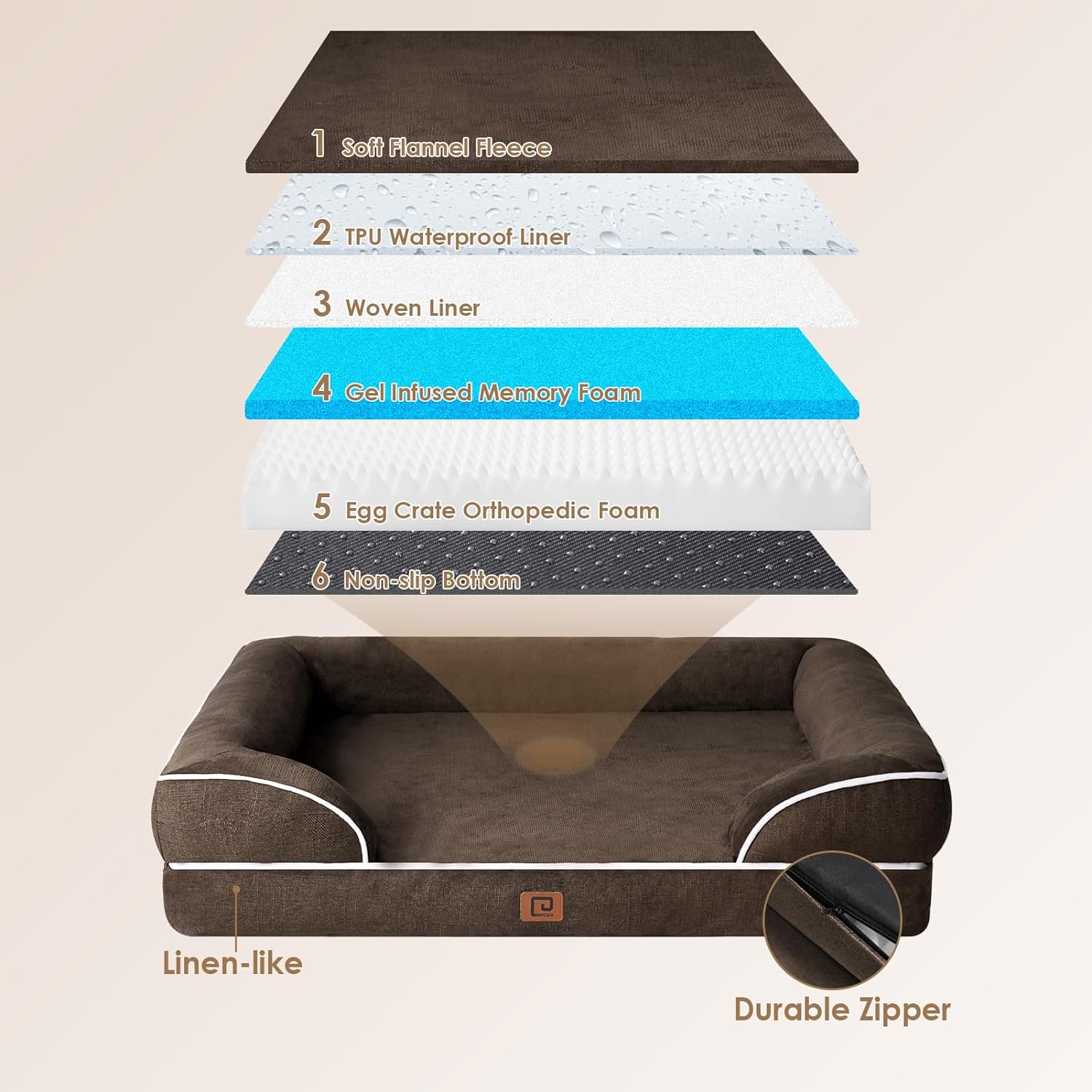 - WATERPROOF COVER: A waterproof film is positioned between the fleece surface and the bottom fabric, ensuring the dog bed remains dry. However, the faux linen sides are not waterproof.