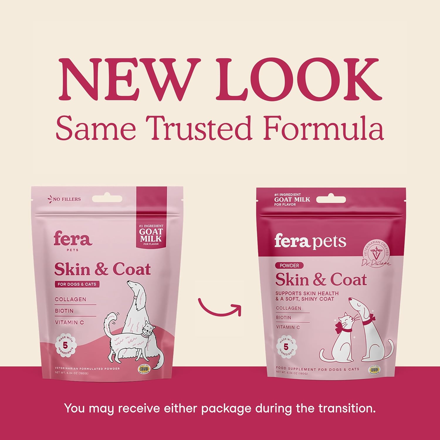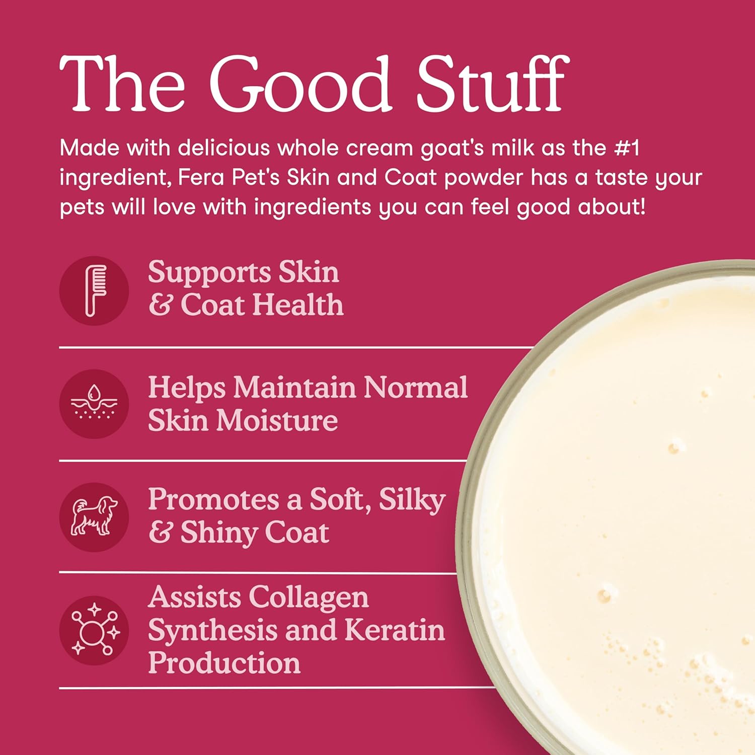 - Cat and dog skin care: Fera’s Skin & Coat goat milk topper contains collagen powder, biotin, vitamin C, plus full cream goat milk for easy digestion; our skin and coat supplement for dogs and cats also helps with coat thickness and shine