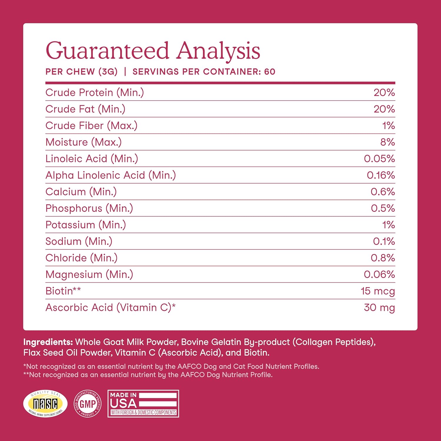 - Veterinarian formulated: Collagen for dogs and cats crafted by our Co-Founder, Veterinarian Dr. Dulake; dog and cat skin and coat supplement bears the NASC quality seal, is made in the USA, GMP-compliant, and does not contain colors, dyes or preservatives