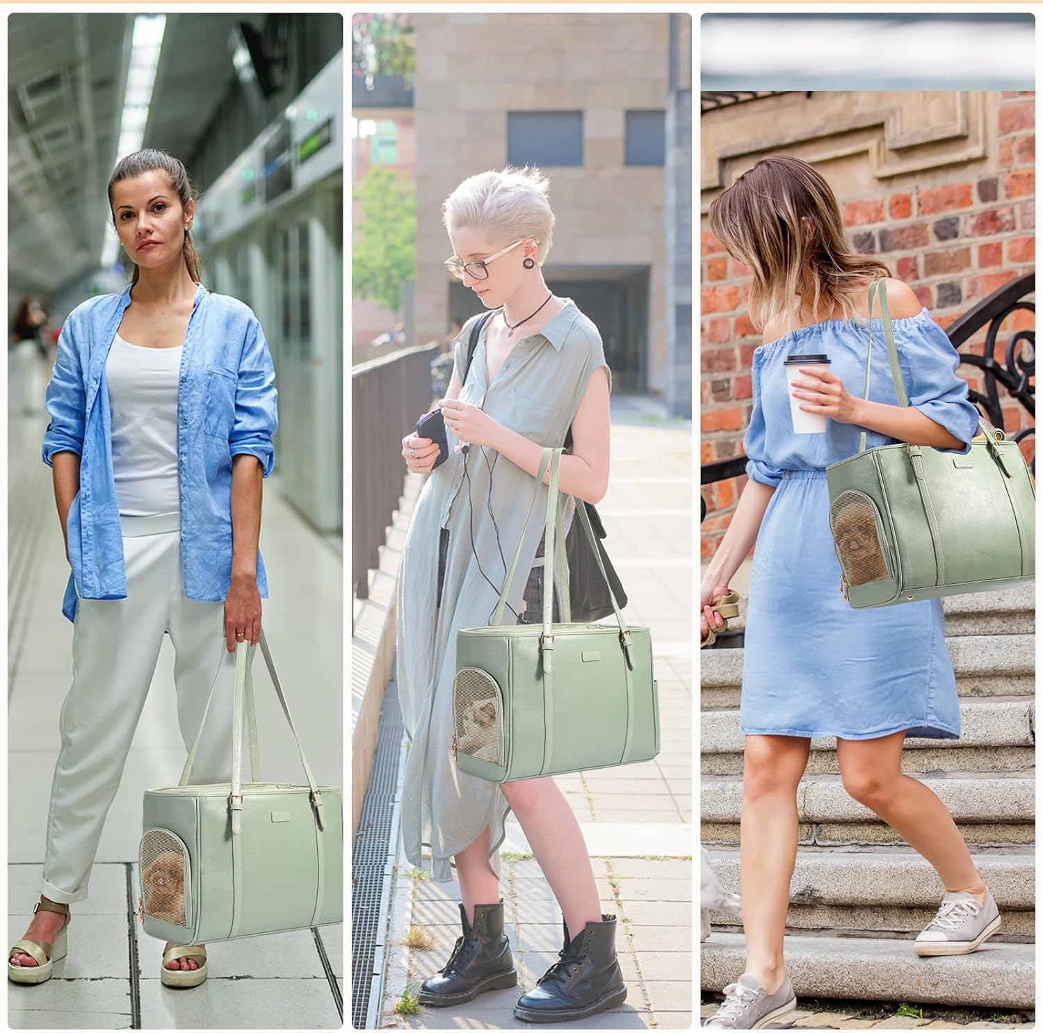 Fashion Dog Purse Pet Carrier Leather Bag for Small Dogs Cats Puppy, Portable Tote Bag Airline Approved Soft-Sided Carriers (Green)