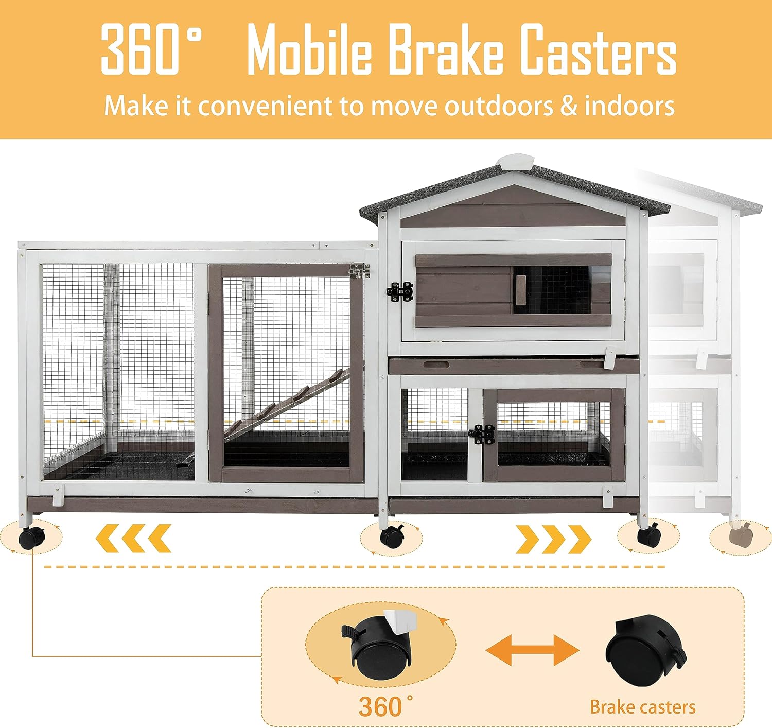 - 🐰【Humanity Design】The 3 removable trays make the guinea pig condo easier to clean which will not leak. The bunny hutch have 6 wheels which are convinient to move. You can easily to retrieve your pets from the cage as the top of the activity area is openable,which is also sinple for you to feed them.