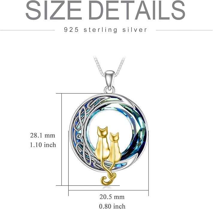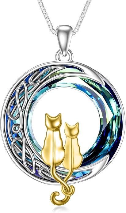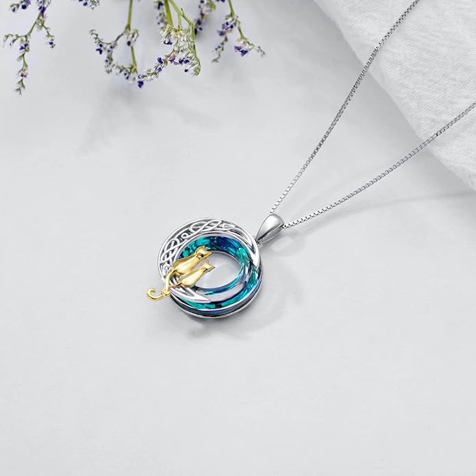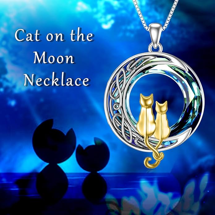 TOUPOP Cat Gifts for Cat Lovers 1 2 3 Cats Necklace Sterling Silver Cat on the Moon Pendant Necklace with Blue Circle Crystal Birthday Christmas Celtic Jewelry Gifts for Women