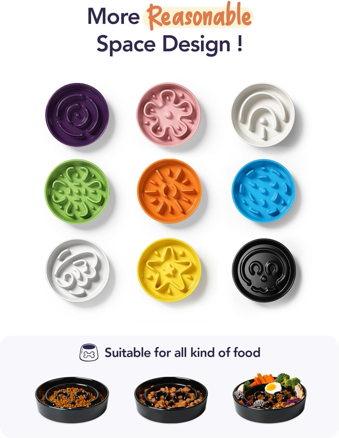 - Slow Down Eating, Bring Dog A Healthy Diet: Fast-eating dogs experience bloat, regurgitation, and obesity easily. Our slow feeder dog bowl design with the ridges and maze pattern helps your dog to eat slower than 10 times. Your dog could change his overeating behavior through a challenge and fun mealtime