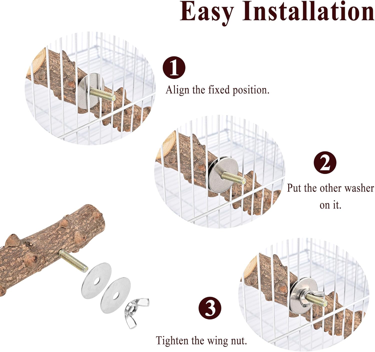 - Easy Installation: Parrot perch stand is designed with a flexible single-lock removal method, which can be installed inside or outside of any cage. Built-in wing nuts and bolts, easy to install and very sturdy, bird perch is a great cage accessory for your favorite pet to play with peace of mind and safety.