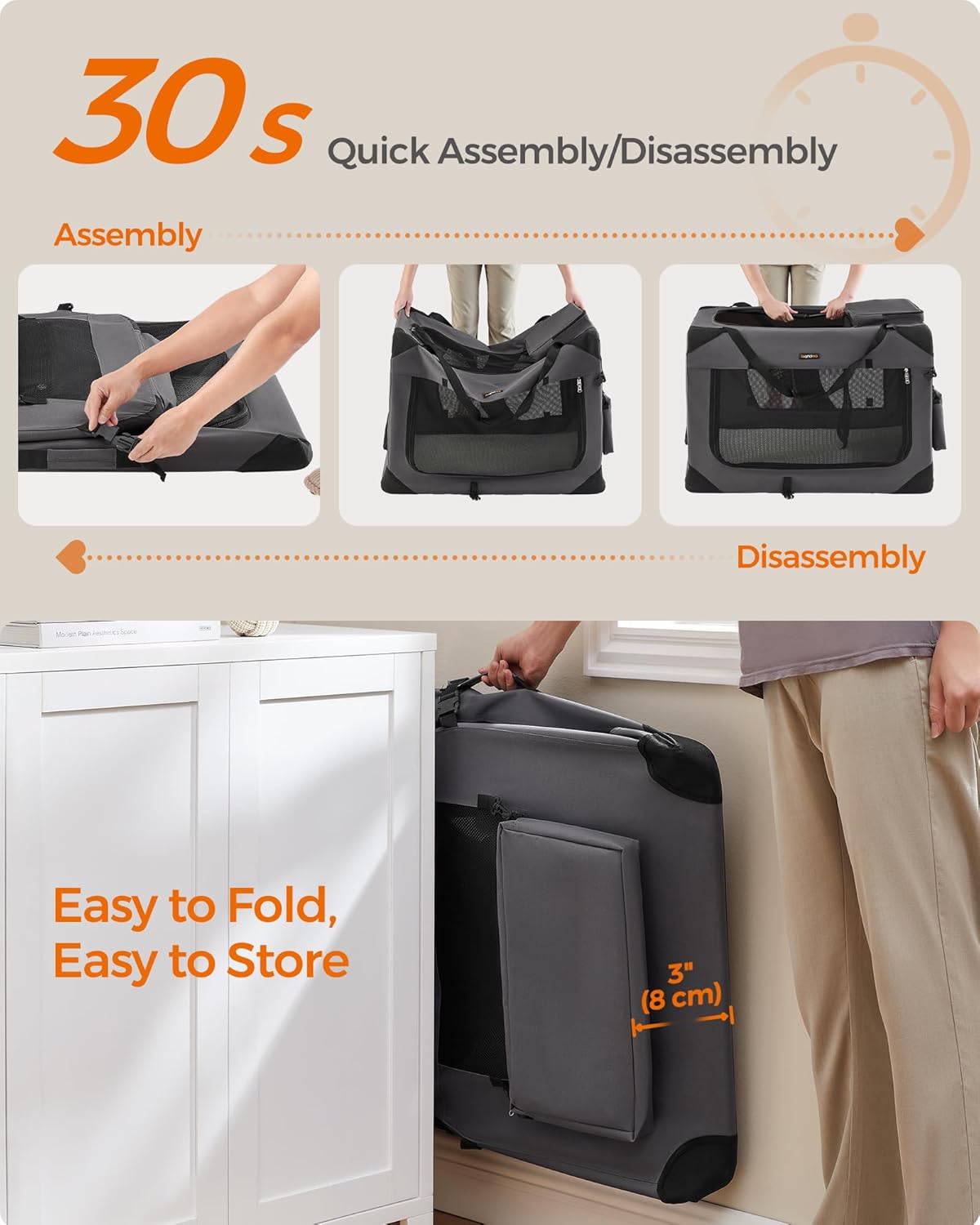 - 【QUICK ASSEMBLY & EASY FOLDING】The dog crate can be assembled in 30 seconds without tools and can be stored in the car or in the corner of your home after folding. It can be easily carried for indoor use or traveling, giving your dog a warm home anytime