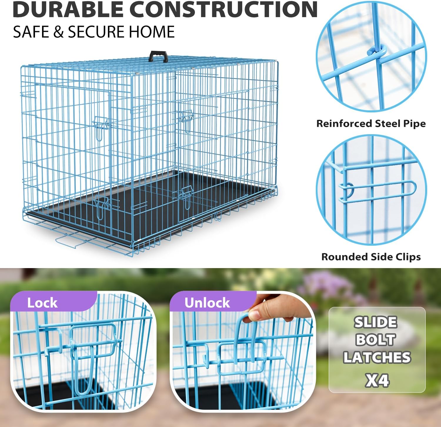 - SAFE & SECURE DOG CAGE: This durable dog cage features reinforced steel pipes, rounded corners, and dual latches on both front & side doors, to keep your pet secure during dog training or quiet time.