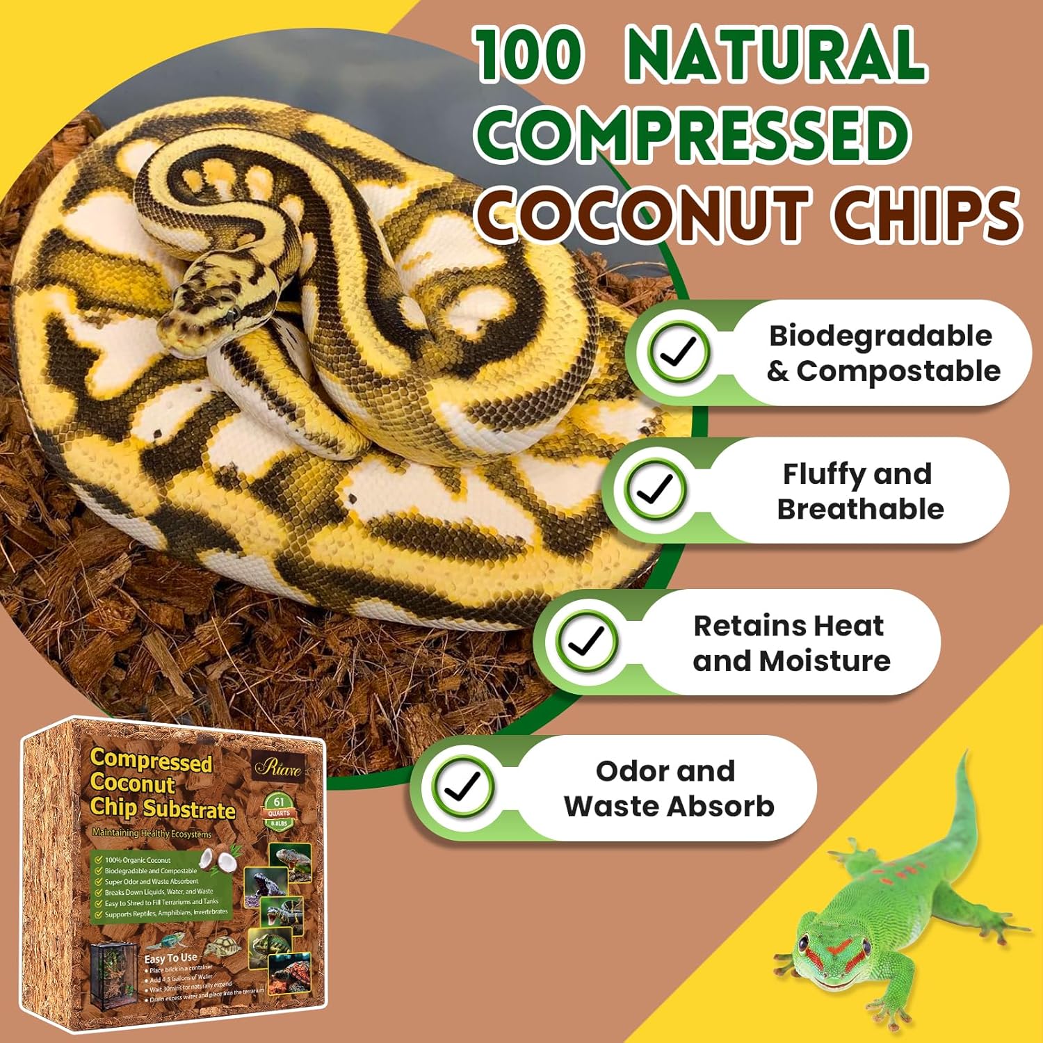 - 【Widely Application】Riare coconut fiber substrate create a fresh and inviting habitat for snakes, geckos, lizards, tortoises and salamanders to rest and explore, that have large coverage area after expansion with water and easy to clean, it's perfect for reptile terrarium, amphibians, burrowing animals and invertebrates.