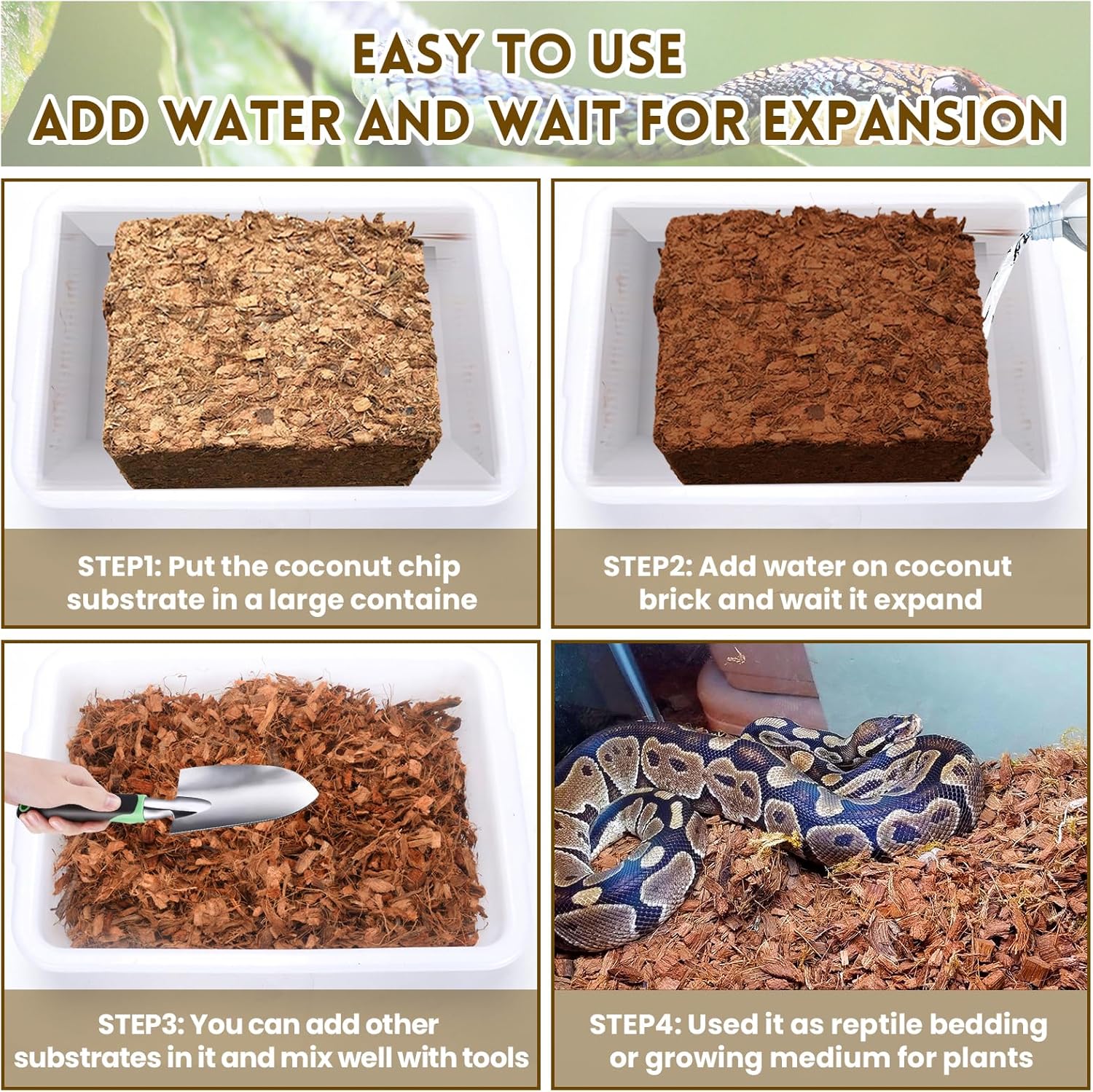 - 【Easy to Use & Disposal】Simple to use, just add water and wait for it to expand, squeeze out the excess water and you're ready to go! Our coconut substrate chips have super odour and dirt-absorbing abilities, which effectively breaks down odors and waste. It not only safe for animals, also can throw it directly in the garden to compost for growing flowers, vegetables and fruits.
