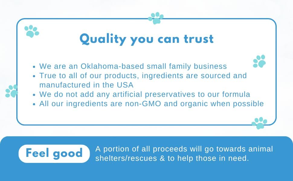 - About us: We are an Oklahoma based, veterinarian owned, family business & appreciate the opportunity to help your pet! All our products are made in the USA. 100% Satisfaction Guarantee!