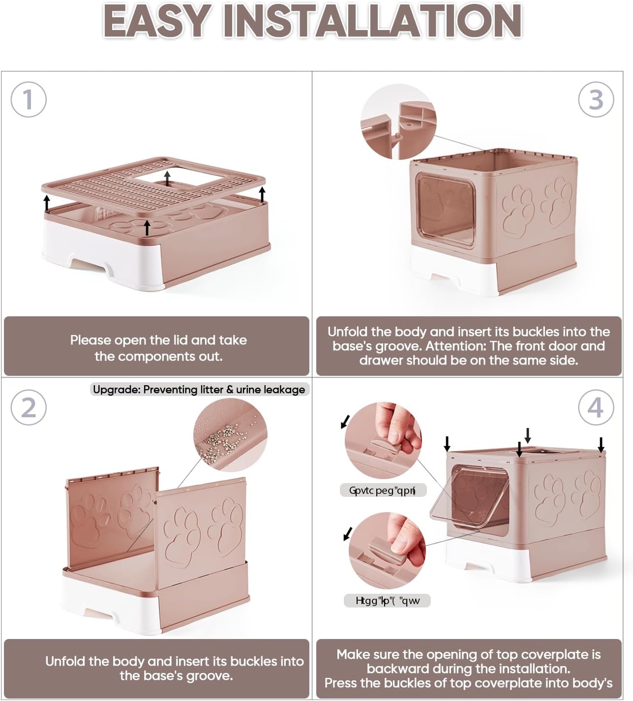 - [Two Ways In & Out ] -By adjusting the snap, you can control that the door can only go in or free out. The self-closing front entryway leaves odor and dirt inside. The top sand pedal prevents the cat's litter from being sprayed everywhere. The enclosed structure secures pet cat's privacy