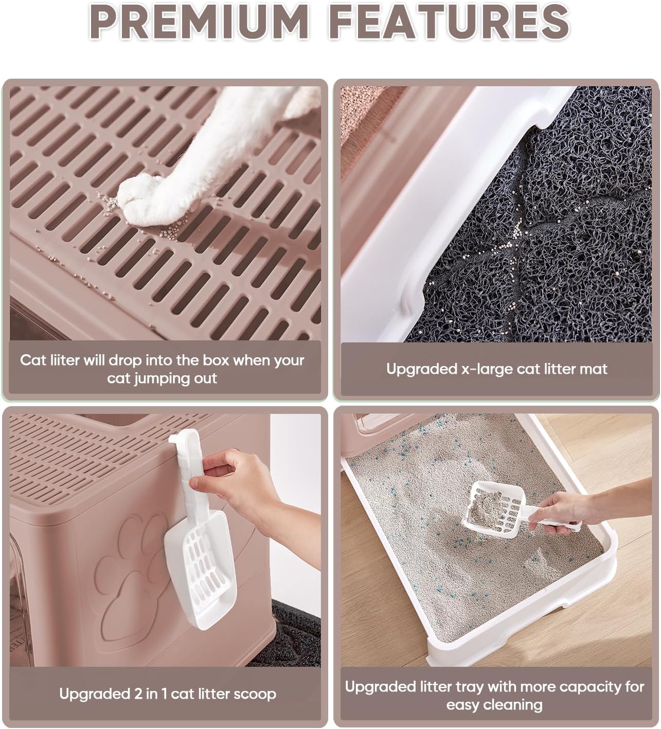 - [Easy to Clean] - The upgraded pull-out drawer design litter tray and included 2 in 1 litter scoop make cleansing of litter a lot easier. Easy for cleaning the feline clutter with minimal mess. Mat is easy to clean with a non-slip back, also suitable to place under feeding bowls to catch spill