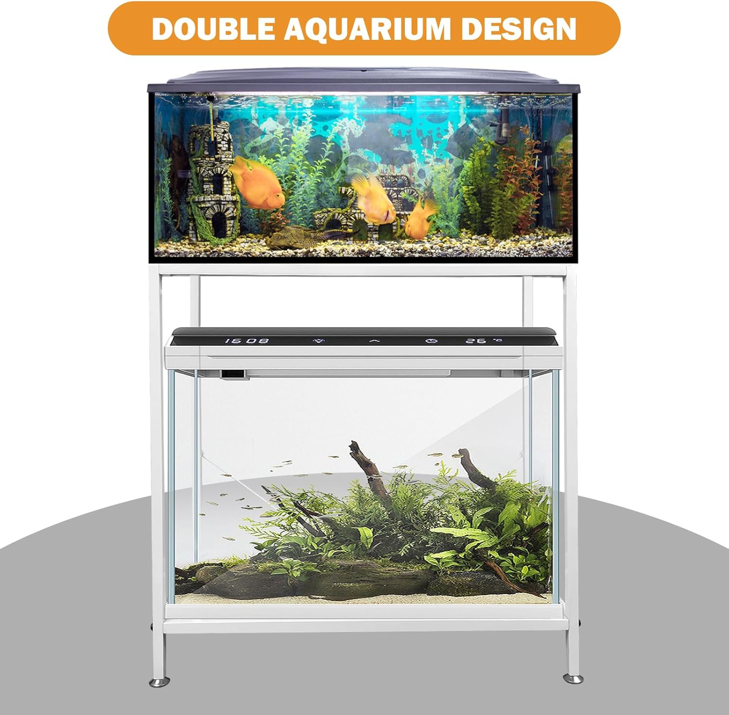- Double-layered structure: Our Aquarium Tank features a minimalist and stylish design with a double-layered structure that meets your aquarium display needs and provides storage space for pet supplies. Alternatively, you can use it to hold two tanks, bird cages, or other pet habitats.