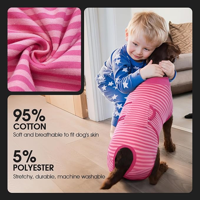 - [BREATHABLE FABRIC]: Our dog recovery suit is made of 95% cotton and 5% spandex. The recovery shirt is highly elastic and breathable, allowing the dog to feel comfortable and move freely after wearing it. No deformation after machine wash.