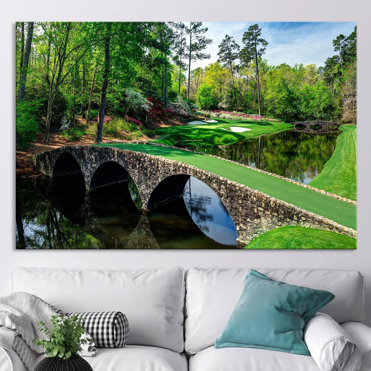 Nature Wall Art Prints - Ocean Forest Mountain Lake Canvas Landscapes - Small to Extra Large Living Room Bedroom Kitchen Bathroom Décor (Golf Course with Stone Bridge, 16L" x 24W")