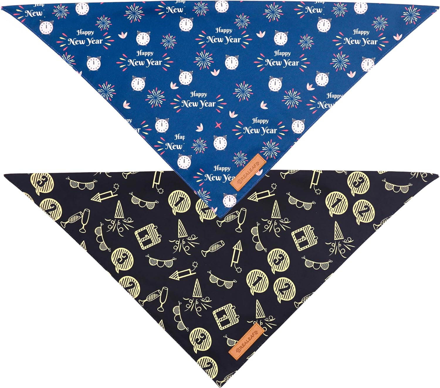 Realeaf Happy New Year Dog Bandanas 2 Pack, Reversible Holiday Pet Scarf for Boy and Girl, Premium Durable Fabric, Bandana for Small Medium Large and XLarge Dogs (X-Large)