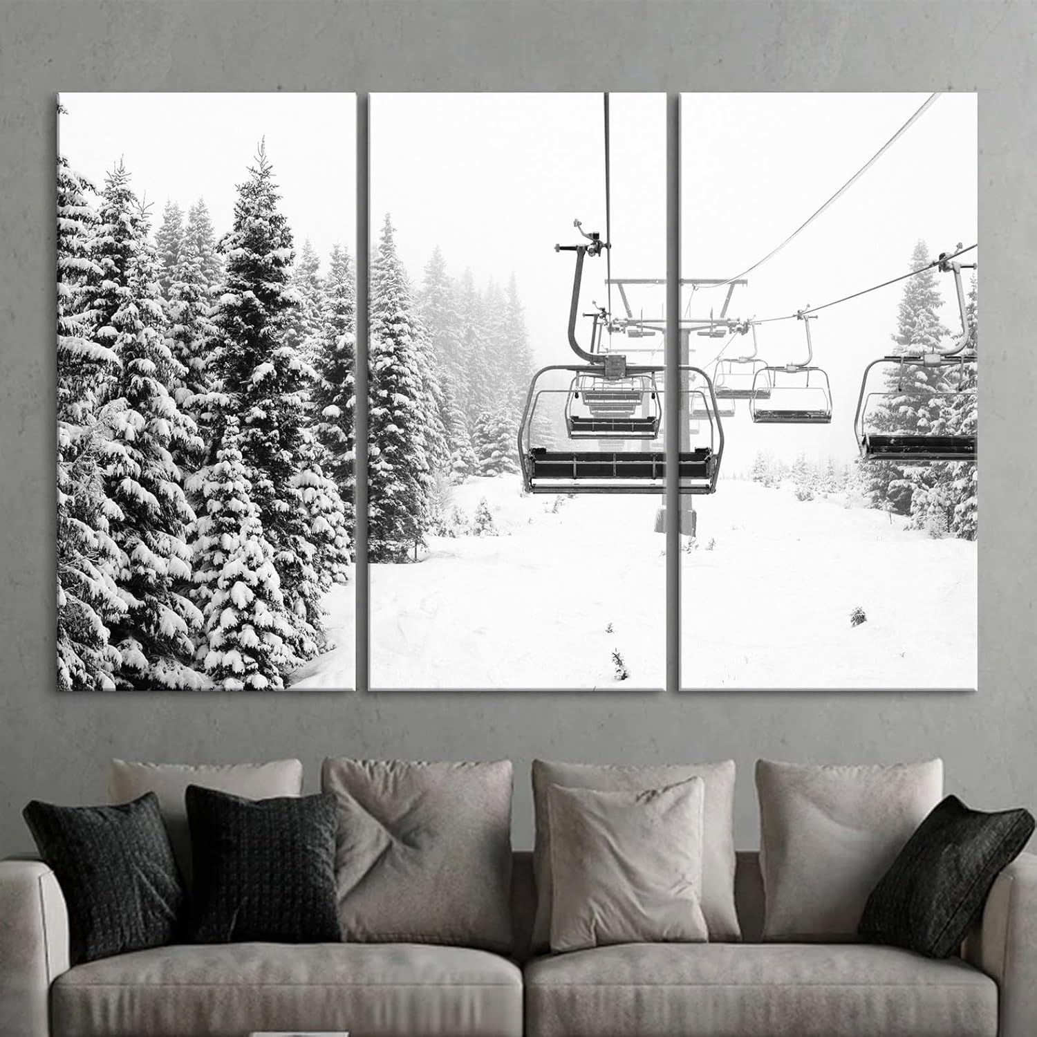 Nature Wall Art Prints - Ocean Forest Mountain Lake Canvas Landscapes - Small to Extra Large Living Room Bedroom Kitchen Bathroom Décor (Ski Lift on Snowy Mountain, 31L" x 47W" - 3 Panels)