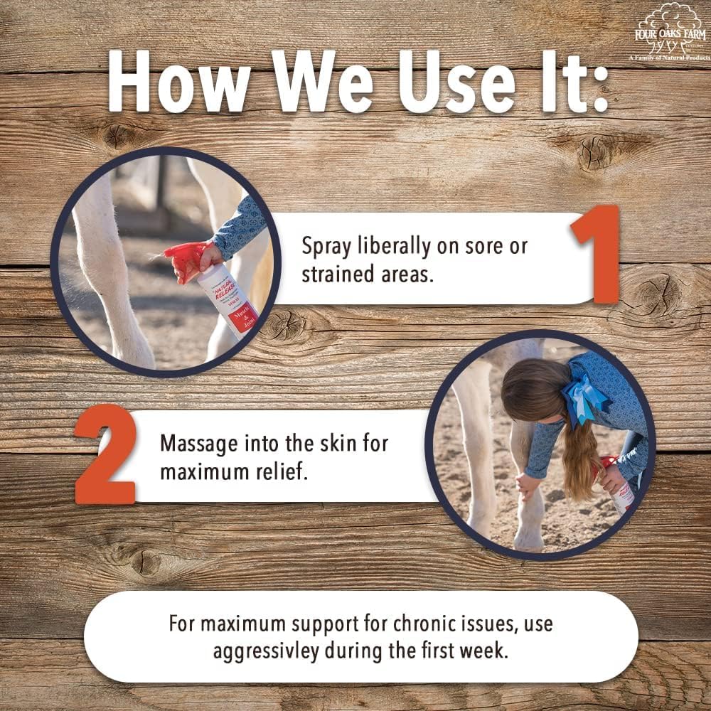 - Get Straight to the Ache: Natural Release Muscle Relaxant Spray works in minutes to help reduce equine muscle and joint stress, arthritis, tendonitis, discomfort, bruising and inflammation. Can be used before or after physical exercise - we recommend both.