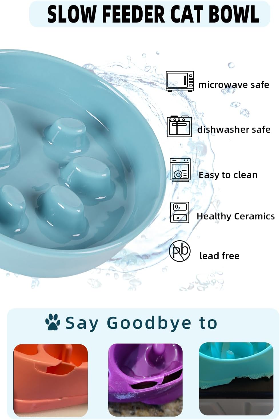 - CERAMIC MATERIALS:Our slow feeding cat bowl is made of ceramic materials. Compared with plastic and stainless steel products, The Ceramic Material are easy to clean, lead free and dishwasher safe