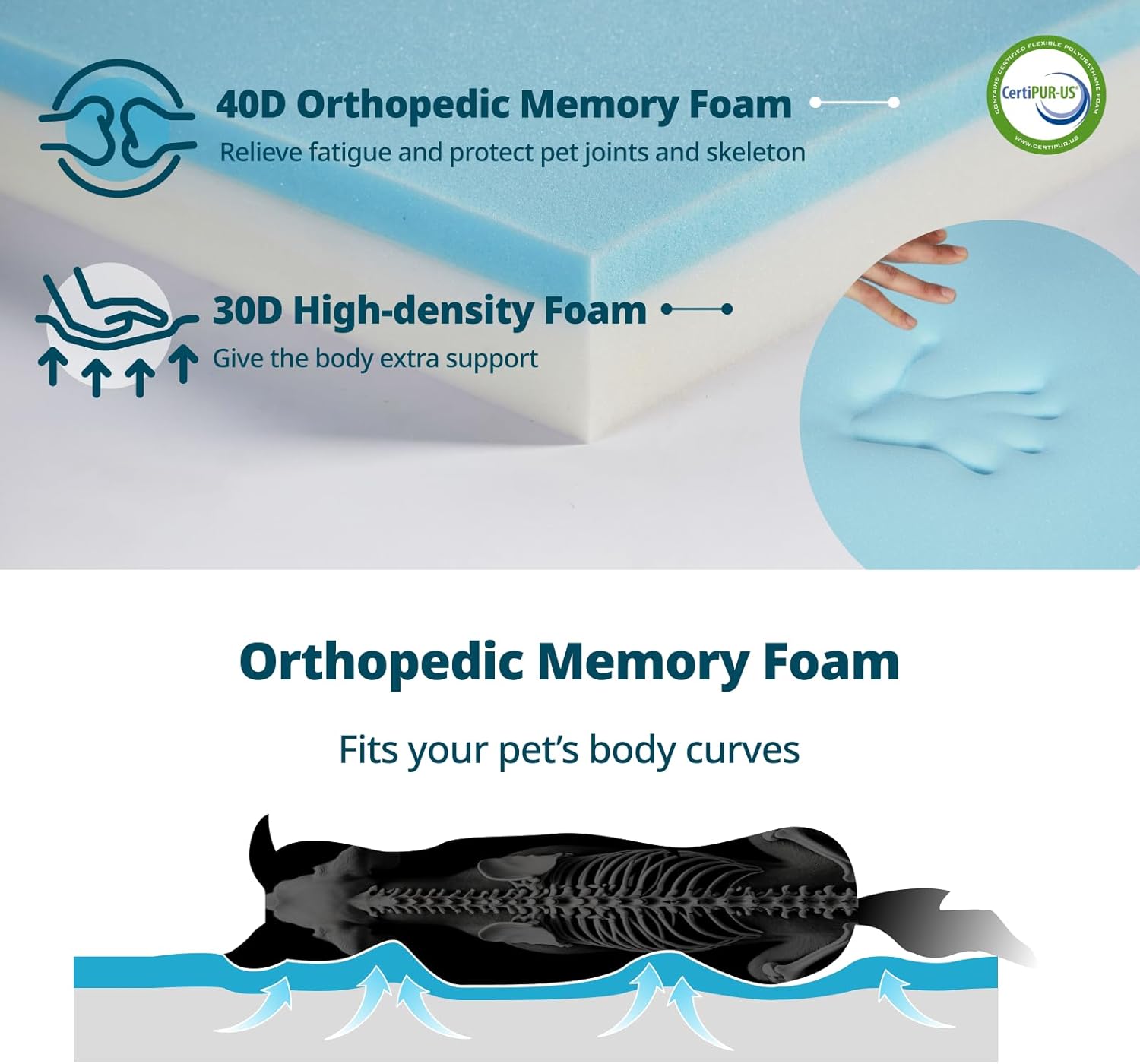 - Orthopedic Memory Foam: Our Dog Bed uses a combination of 40D memory foam and 30D high-density foam. Evenly distributes weight and conforms to your pet's body, reducing pet stress and protecting joints.