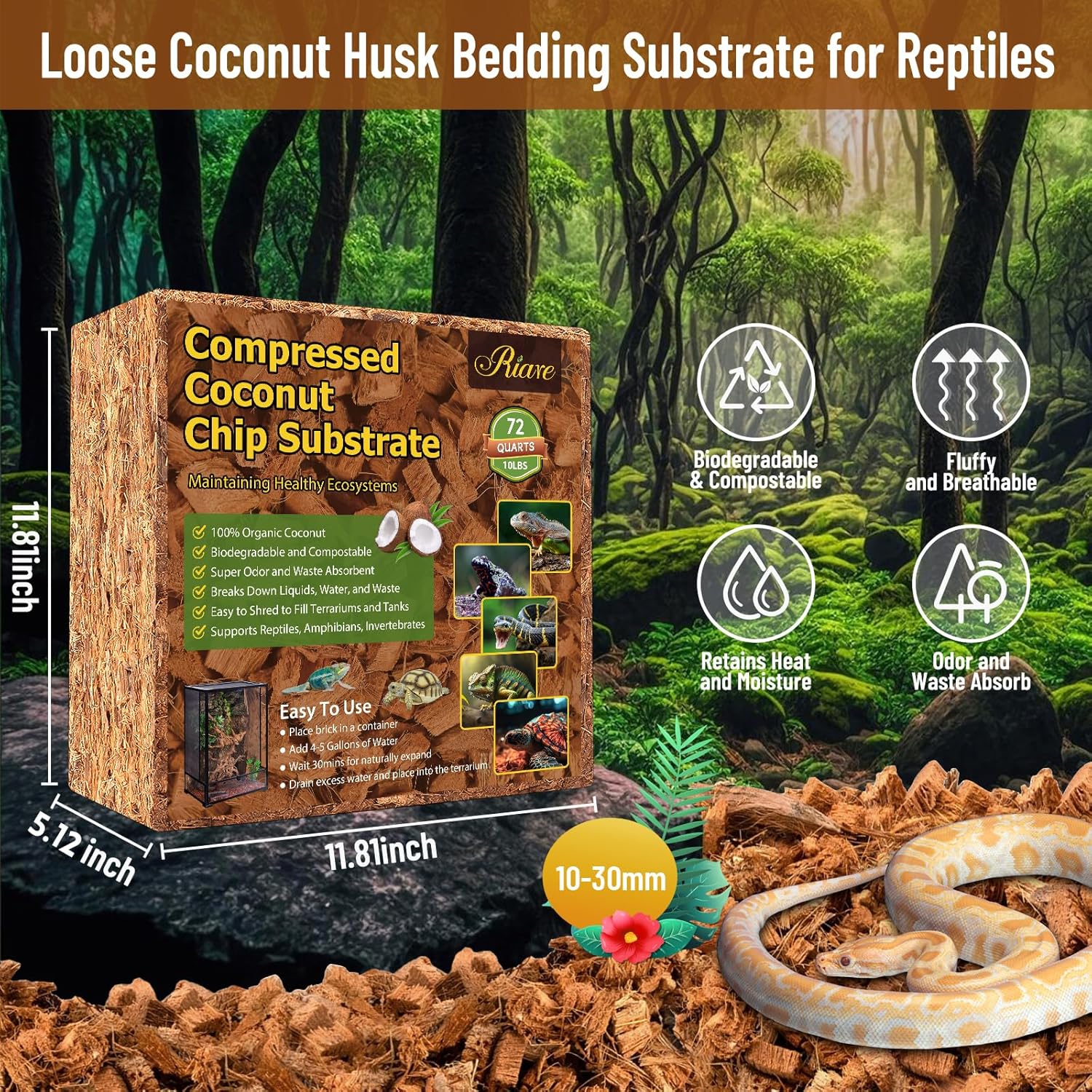 - Compressed Reptiles Coconut Chip Substrate: You will receive a coconut husk brick, size 11.81 x 11.81 x 5.12 inch and weight 10 lb, 72 Quarts that expands well and easy to use, biodegradable and renewable. Our coconut husk bedding for reptiles can maintain the health of the ecosystem and create a safe, clean, natural habitat for animals