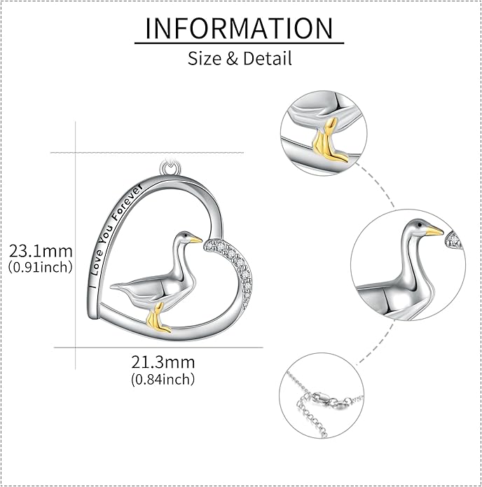- 【925 Sterling Silver Goose Pendant Necklace】The goose pendant necklace is made of 925 sterling silver, and the goose necklace is decorated with a goose and love pendant. The goose pendant necklace is anti-allergic, anti-rust, anti-nickel, lead and cadmium. The goose necklace is suitable for long-term wear, durable and not affected by any allergic elements. The goose pendant necklace comes with an exquisite box and polishing cloth