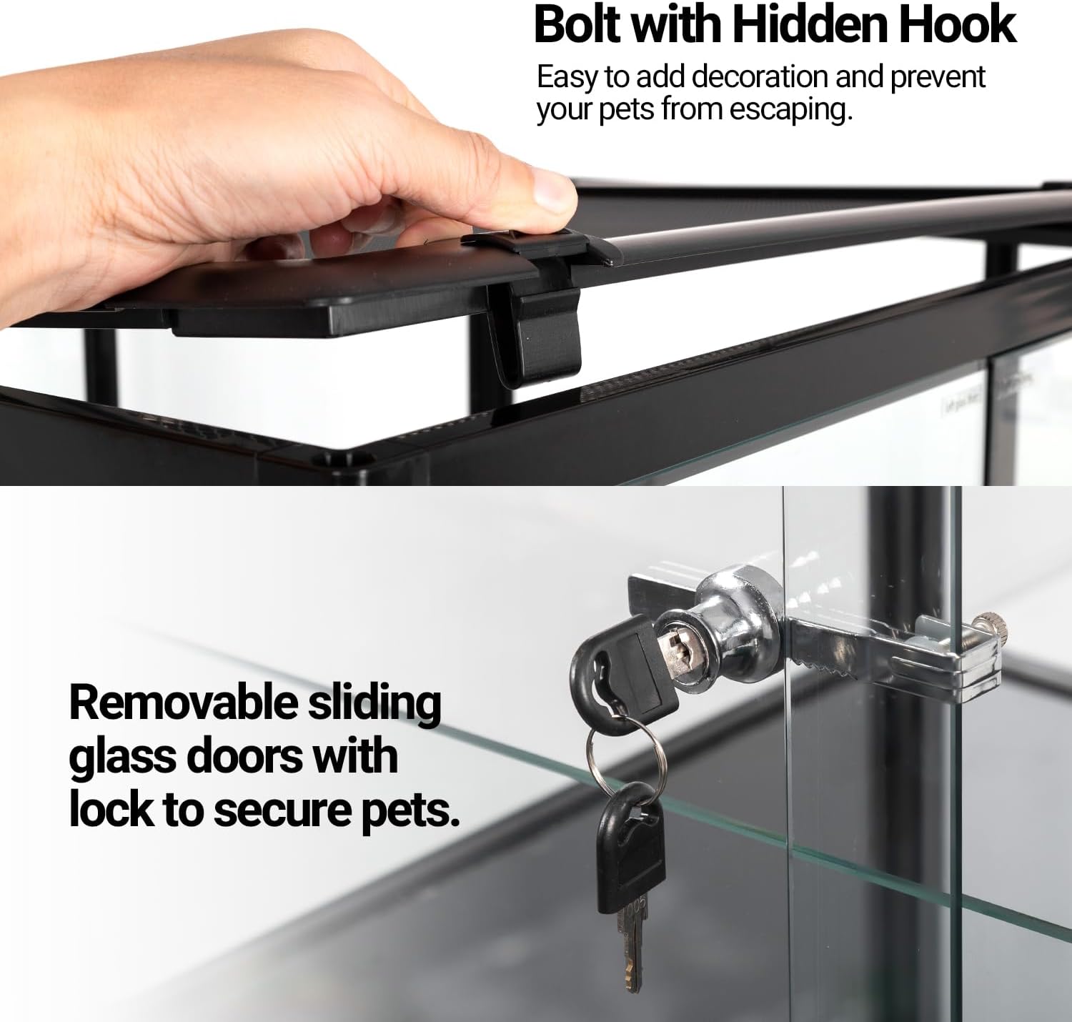 - 【Large Reptile Terrarium with Front and Top Opening】This reptile habitat cage is not only with front opeing doors, but also with a top opening cover, so easy for daily maintenance and pets feeding. The safety lock could prevents pet escape.
