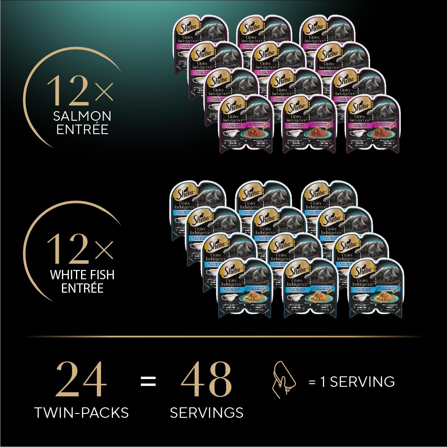 Sheba Gravy Indulgence Adult Wet Cat Food Salmon Entree and Whitefish Entree in Extra Gravy Variety Pack, 2.6 oz. Twin-Pack Trays, (12 Count, 24 Servings) (Pack of 2)