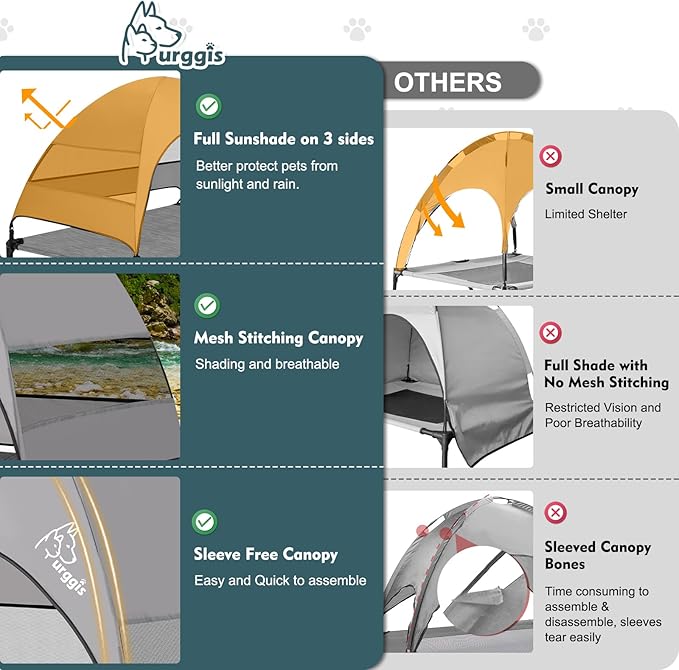 - Wider & Larger Shade Lifted Dog Bed: Comes with a large waterproof UV-proof canopy, this outside dog bed provides great shade than most other dog cots. Further more, with mesh piecing on 3 of the sides, this canopy will allow great air flow and will not block dogs' view. With this item, you will be rest assured when pets relaxing outside in summer;