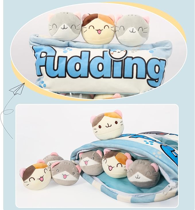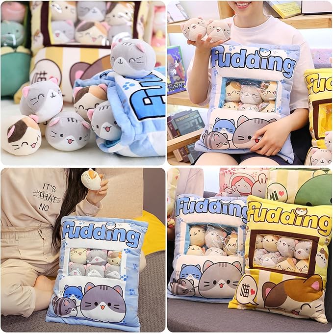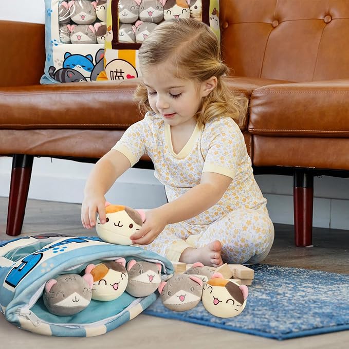 Cat Plush Pillow, Cute Plushies with Kitten Doll, Bag of Removable Kitten Stuffed Animals, Kawaii Plushies Cat Toy for Kids, Gift for Girls Boys Birthday (8 Blue Kitten)