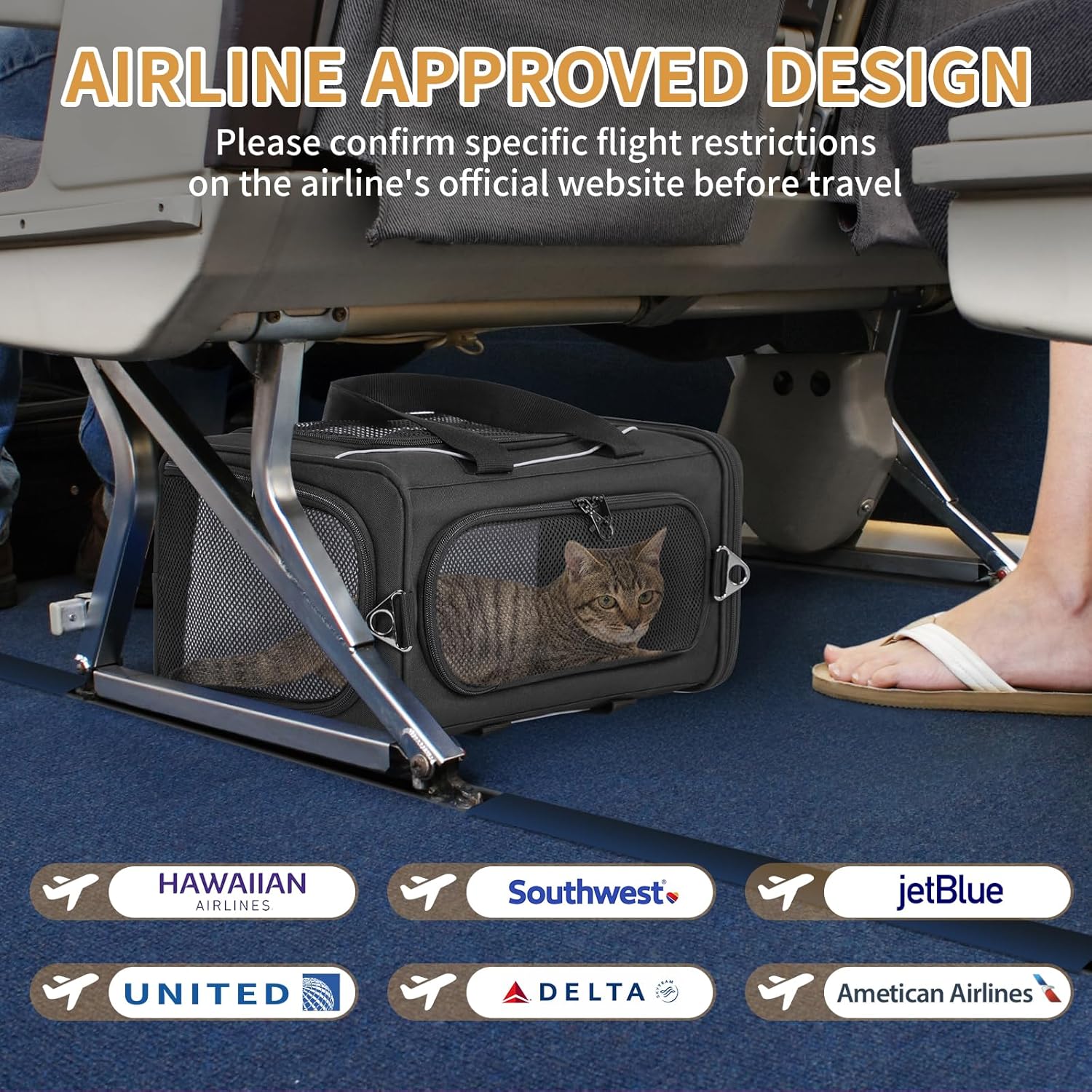 Petsfit Airline Approved Pet Carrier for Small Cats, 16.5x8.6x11 TSA Approved Carrier, with Removable Dual-Sided Padding (2-Way Placement) - Fits Under Most Airplane Seats, Escape Proof (Black)