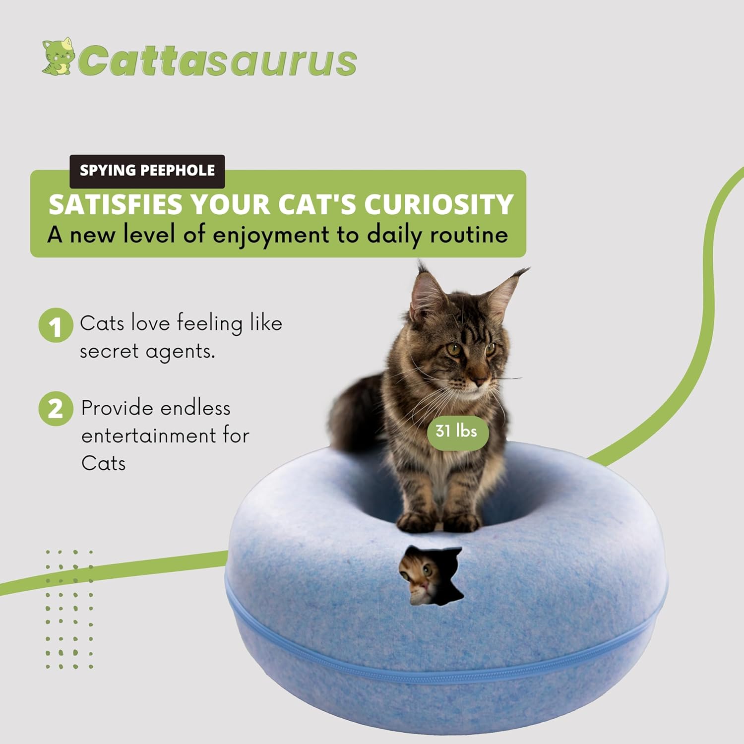 - Sturdy, Eco-conscious & Cat-friendly: The Peekaboo Cat Cave is made with durable, non-toxic, and odor-resistant materials, ensuring it maintains its shape and withstands regular use. Its cat tunnel bed, constructed from selected wear-resistant felt material, prevents fluffy ball formation and allows for safe scratching and rubbing. With all-season versatility, the Peekaboo Cat Cave provides a cozy and comfortable donut bed and tunnel, offering year-round enjoyment for your feline companion.