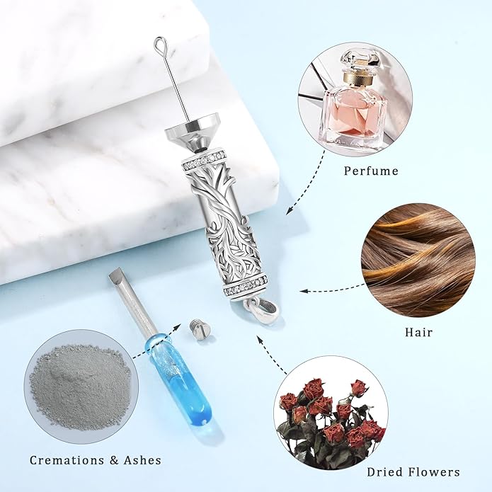 - Memorial Jewelry: the tree of life urn necklace can store your memories in a very special way. Unscrew the top of the urn chain to store a small amount of ashes, hair, nails of a loved one or pet. A special way to remember someone and keep him or her in your heart.