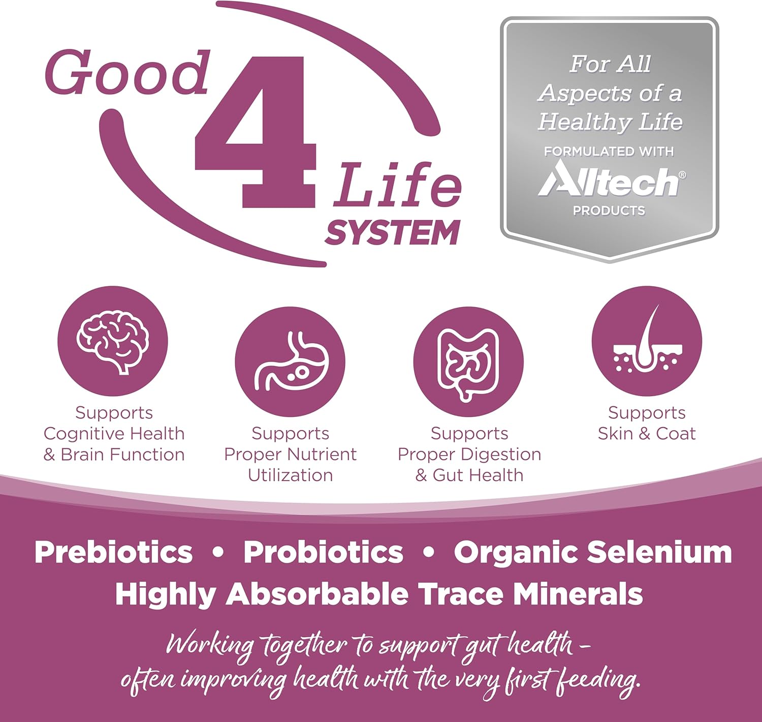 - Our proprietary Good 4 Life+ system includes 4 key ingredients that work together to support gut health and the overall well-being of your pet plus the inclusion of NVGEN for high animal protein diets.
