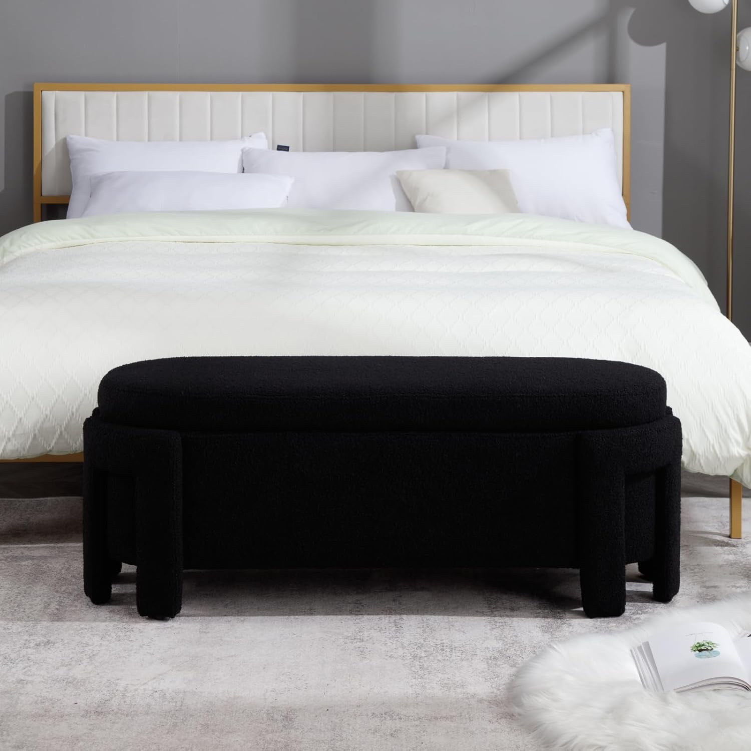 Modern Upholstered Storage Bench, Sherpa Fabric 50" Long Entryway Bench with Storage and Seating, Comfy Cute Ottoman Bench for Living Room/End of Bed/Hallway, Black