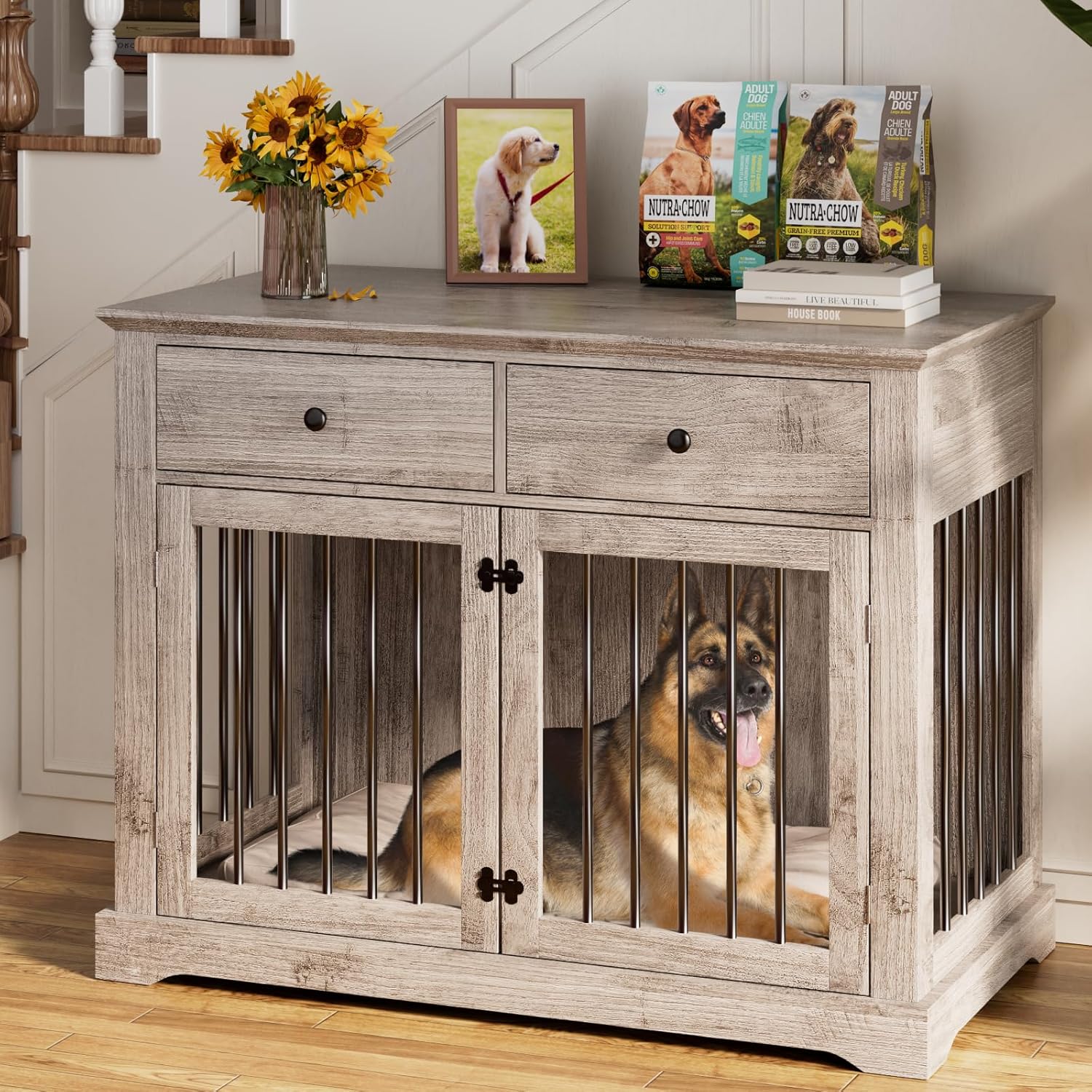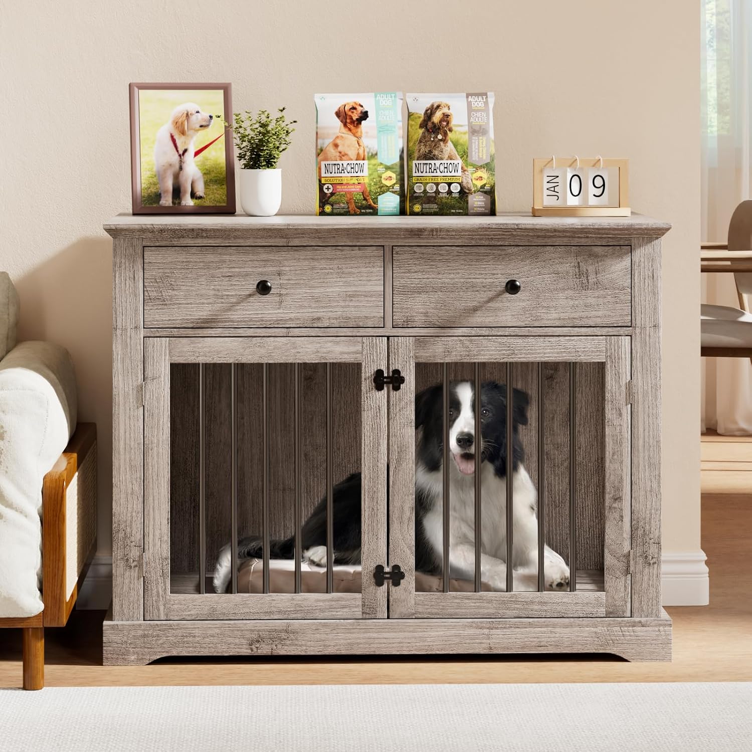 PUKAMI 44inch Dog Crate Furniture with Drawers,Wooden Dog Kennel Furniture for Large Breed,End Table Wood Dog House for Indoor use (Grey)
