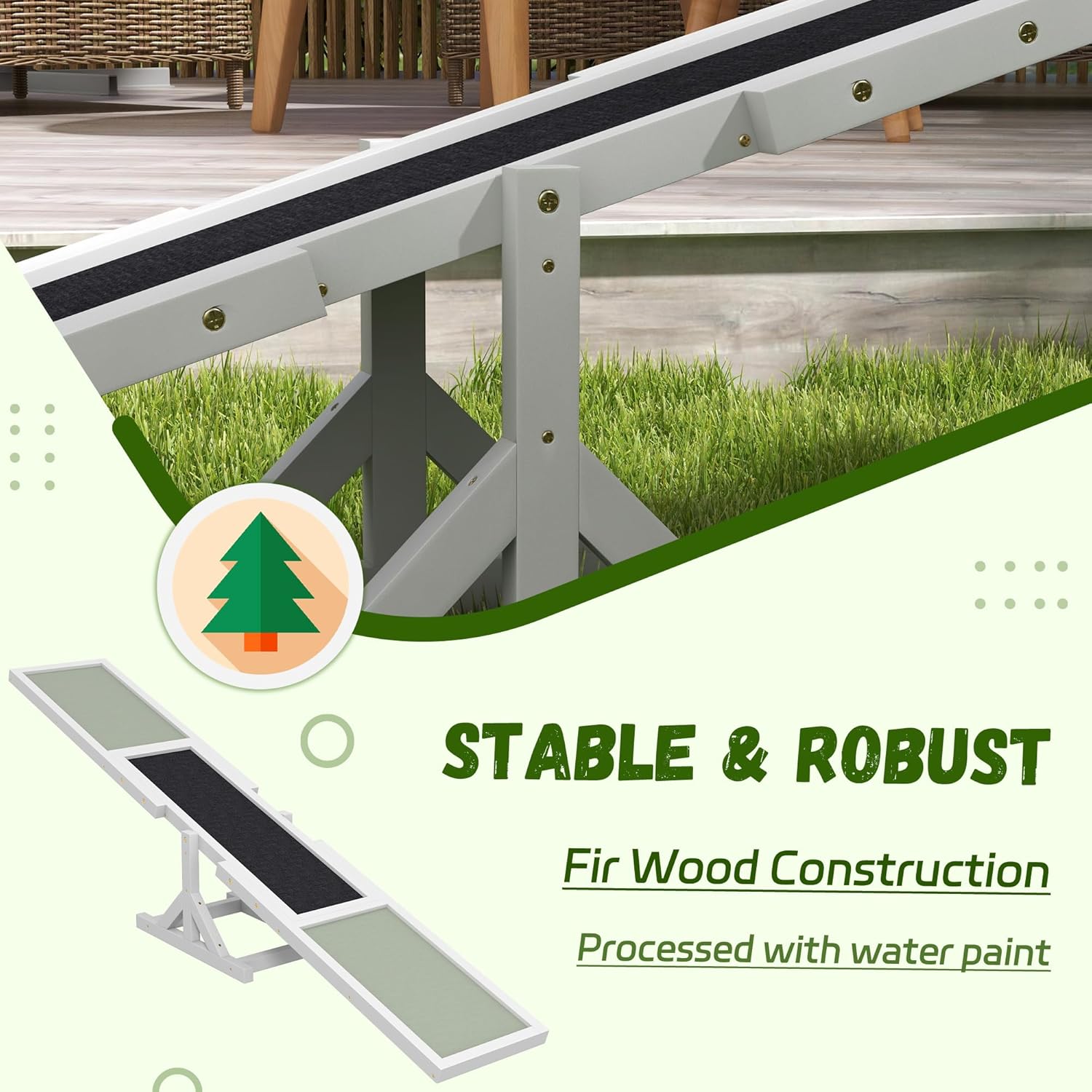 - Solid Construction: Give your furry friend a dog agility seesaw suitable for daily use. Our seesaw is made with fir wood for a structure that's outdoor-friendly and easy to maintain.