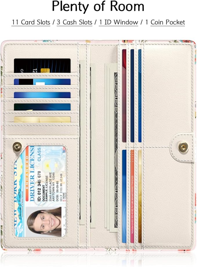 - Large Capacity: Ladies wallet designed with 11 card slots, 1 visual ID window, 1 zipper coin pocket, 3 long cash & receipts compartment, you can put 1 - 2 cards into each card slot. Plenty of room, enough to satisfy all your needs for an everyday wallet