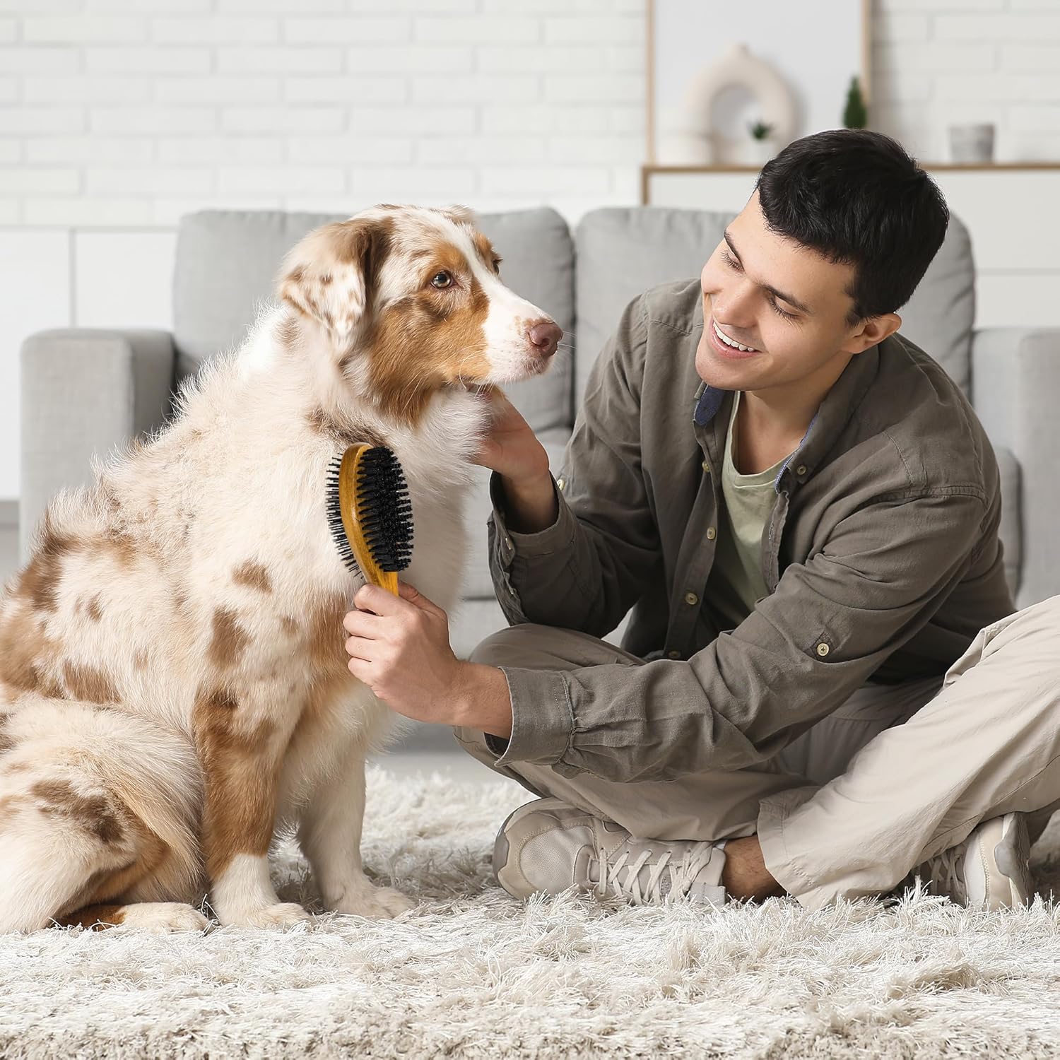 - Smooth, shine & condition (Boar Bristle Side): The natural boar bristle side is perfect for finishing. It smooths the topcoat, removes fine surface debris and dander, and helps distribute natural skin oils for a healthy, glossy shine. Ideal for short coats and sensitive skin.