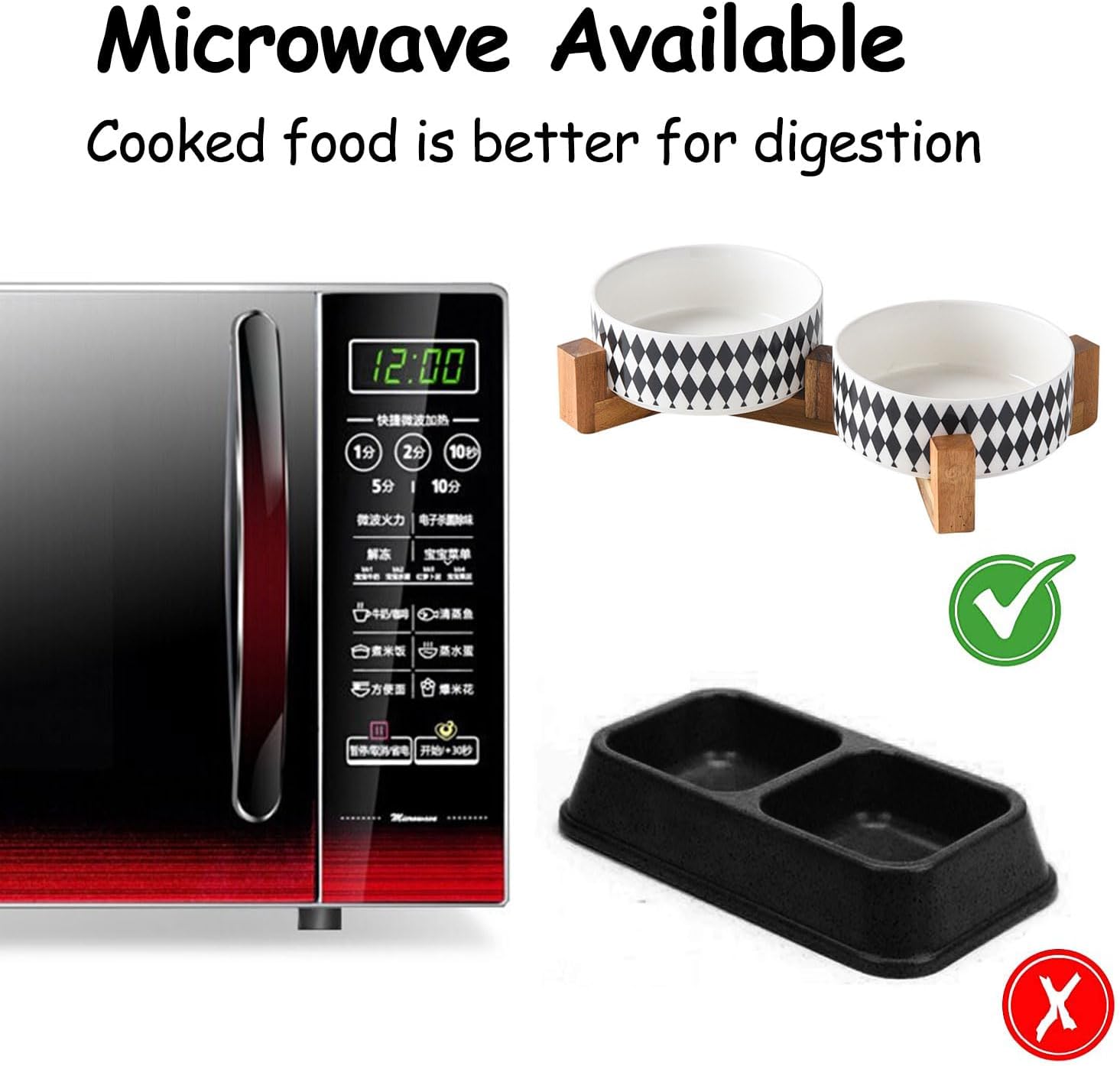 - EASY TO CLEAN CERAMIC - This easy clean dog bowl set is dishwasher proof, as well as easy to handwash and wipe down. With thick walls, these ceramic bowls for pets are sturdy, weighty yet not too heavy. Double Bowl Design:One dog bowl for food and one for water, Each ceramic cat bowl has a Unique wooden stand, raising the dishes closer to your pet for more comfortable eating
