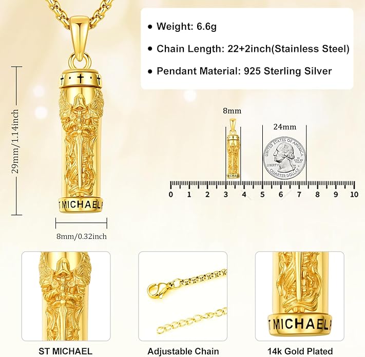 - Size: The archangel St Michael urn pendant: 8* 25mm (0.32 * 1.14 inch), silver Saint Michael cremation pendant weight: 6.6 g. Saint Michael memorial necklace is bright, highlighting the personality,which is simple and elegant, suitable for men, husband,fathers,grandfather,brother,son, etc.