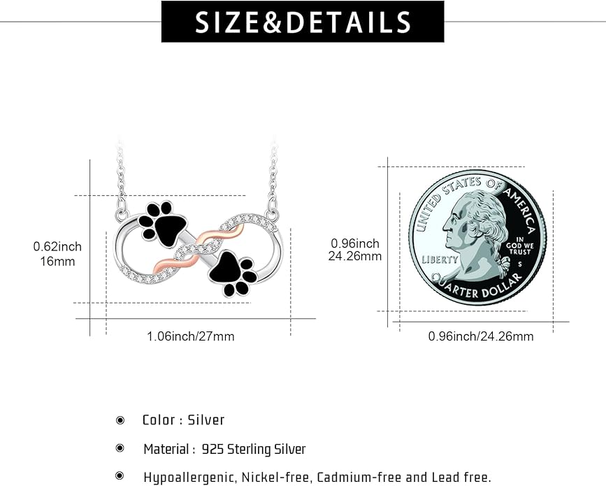- 【Dog Paw Necklace Material】: The infinity cat paw necklace is made of 925 sterling silver, never fade, smooth and shiny, lead and nickel free, non-allergenic. The surface of the infinity paw print jewelry for women is printed with S925, suitable for long-term wear, prevent allergies and maintain health.