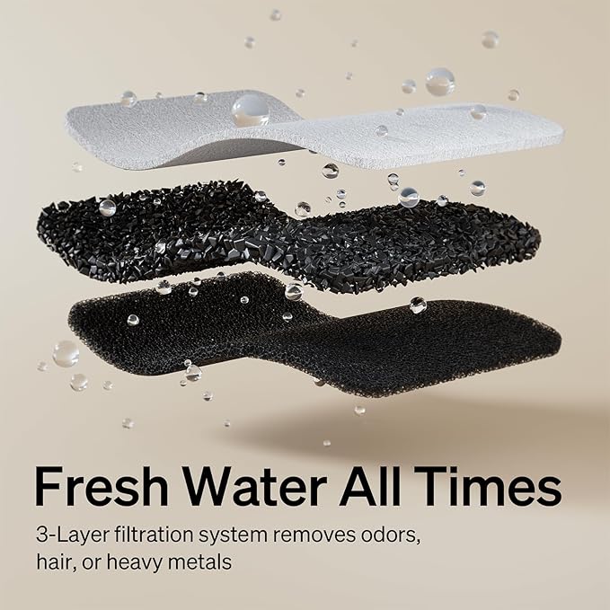 - 24/7 Filtered Fresh Water: This dog water fountain is equipped with a filter and pre-filter sponge. The double filtration system filters hair and other debris to remove odors and impurities, providing purified running water for your pet. (Replace filter every 2-4 weeks) Search "B08ZCTGNGD" for filter.