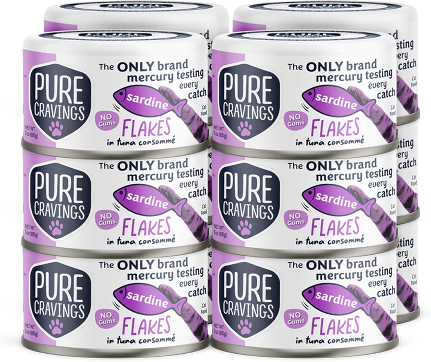 Sardine Flakes in Tuna Consommé, Canned Wet Cat Food Soup, 100% Mercury-Tested, Moist Can Fish, Grain-Free Protein, Non-GMO, 3oz, Pack of 12