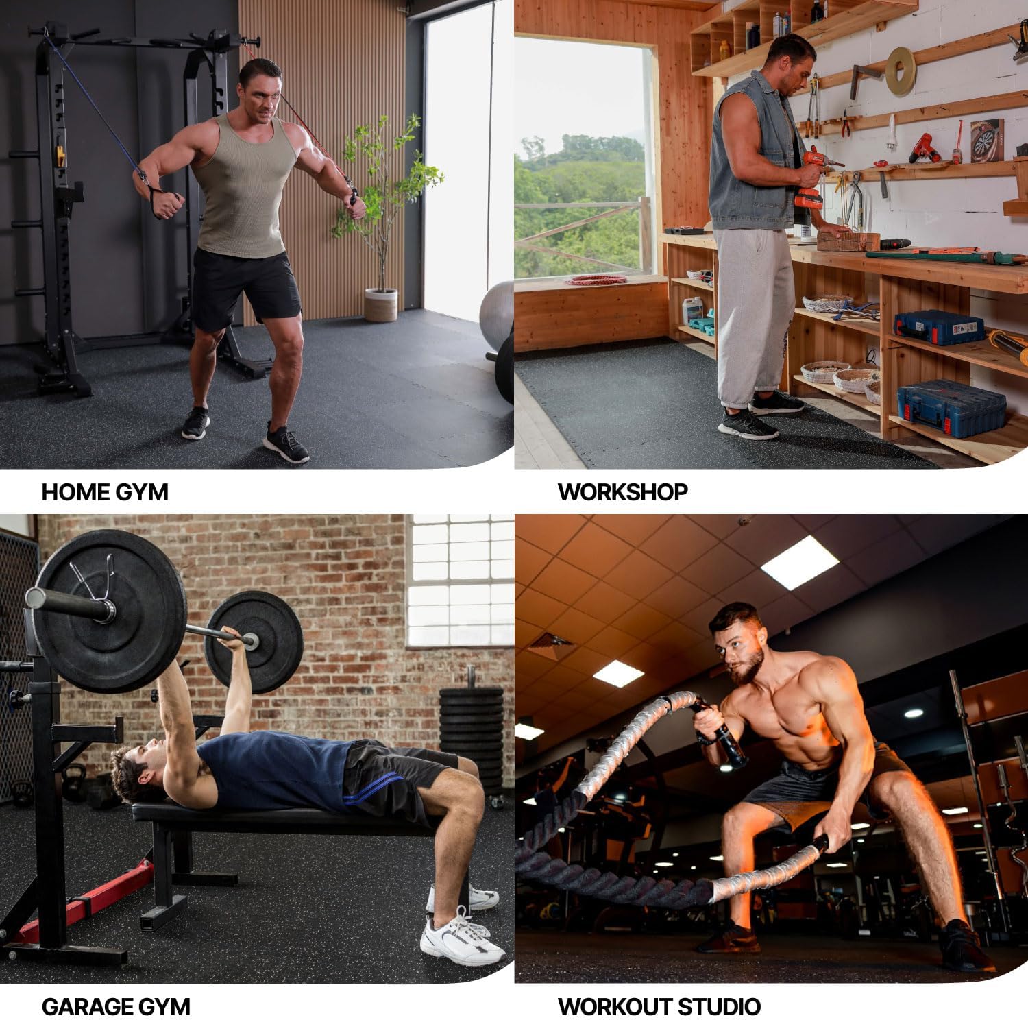 - [Sturdy Rubber Build]: Crafted from premium recycled rubber, our gym mats handle intense workouts with ease. These resilient tiles effortlessly support heavy machinery, providing reliable floor protection against scratches, scuffs, and dents from weights, dumbbells, medicine balls, jump ropes, and other workout gear in a home gym.