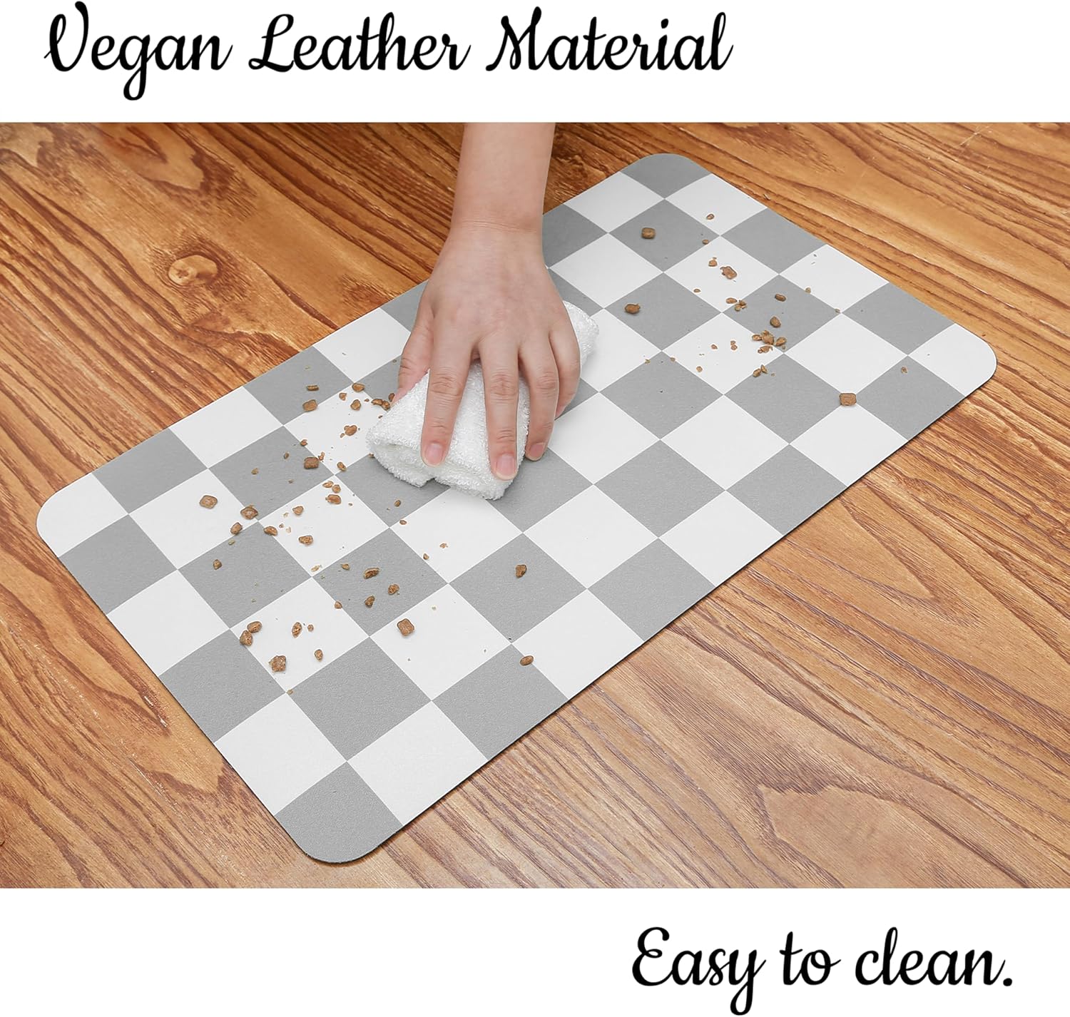 - Quality Material: Made of high-quality vegan leather, this product is designed to be durable, sturdy, and pet-friendly. The vegan leather material not only provides longevity but also ensures a comfortable surface for your pets. The rubber backing is specifically designed to offer a tight grip on various floor surfaces, including tiles, preventing any slipping or sliding.