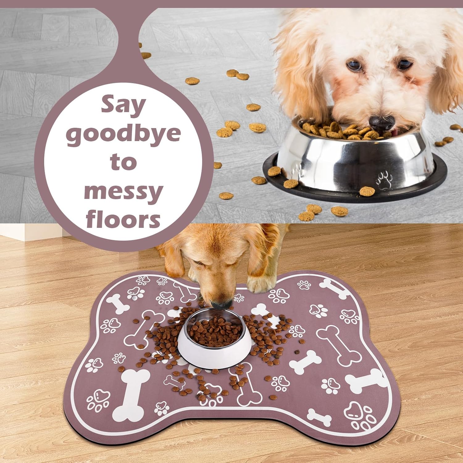 - Cute Design : Our pet feeding mats are designed with dog paw and bone patterns that are so cute. And available in a variety of colors, sizes and shapes to suit different styles of pets, it can provide a dedicated space for your pet's food and water bowls and add a touch of personality to your home decor.