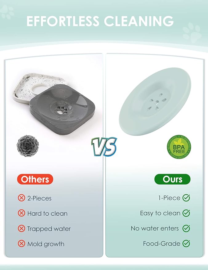 - 【One Piece Molded Floating Disk】Besides lid, the bowl also goes with a floating disk to slow down water drinking, also helps prevent dust, dirt, and pet hair from falling into the water. What’s more, it is an upgraded one piece molded floating disk, no water seepage, never get moldy or dirty, no need to pry open for cleaning.