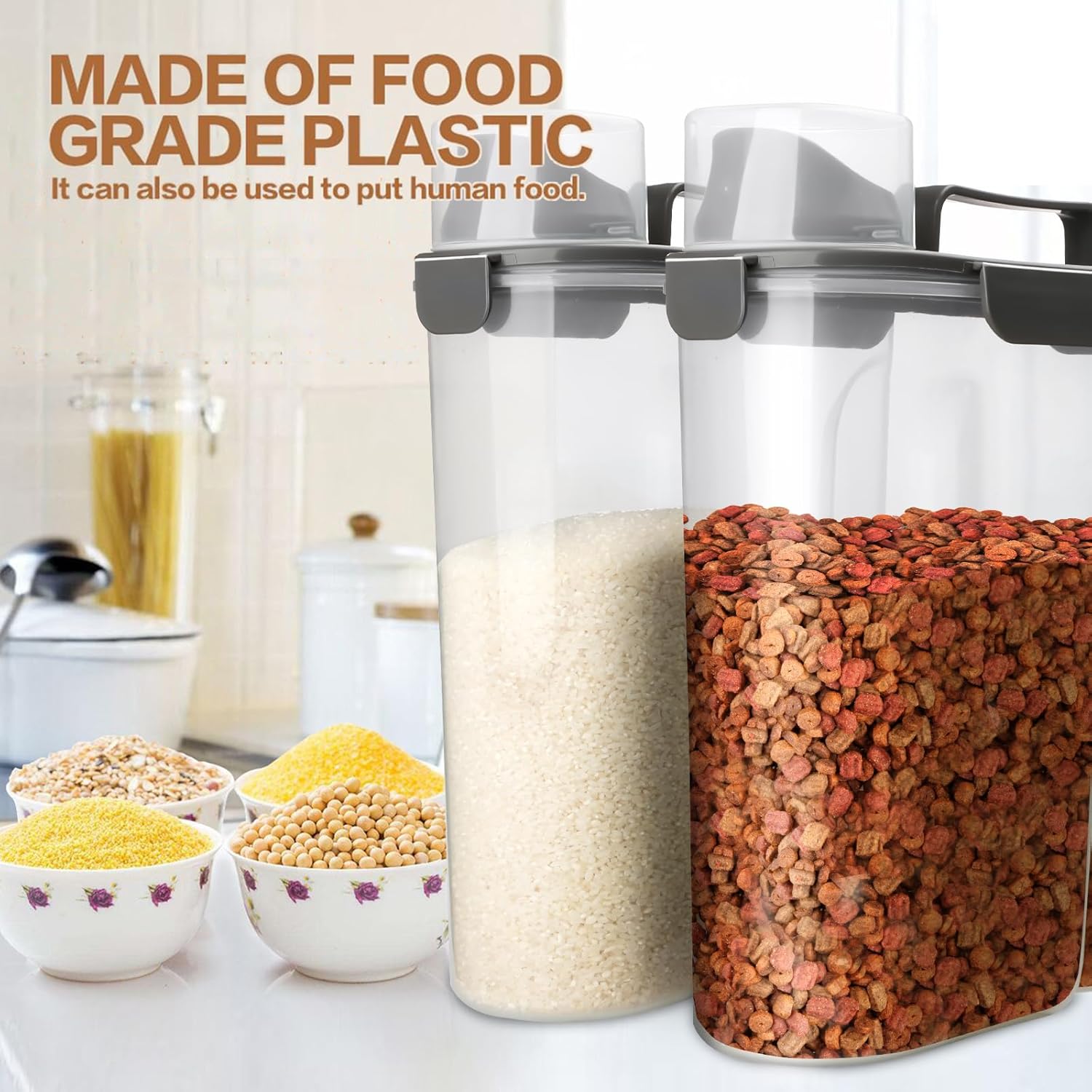 - 2 PACK Pet Dry Food Storage Container - It come with a 6Qt and a 3Qt Dog Food Container. The 6Qt dog food container can hold about 5lb pet food or 10lb rice. The 3Qt dog food container can hold about 3lb pet food or 5lb rice. It also works well for regular kitchen food. Such as rice, flour, cereal, beans, nuts, snack and more
