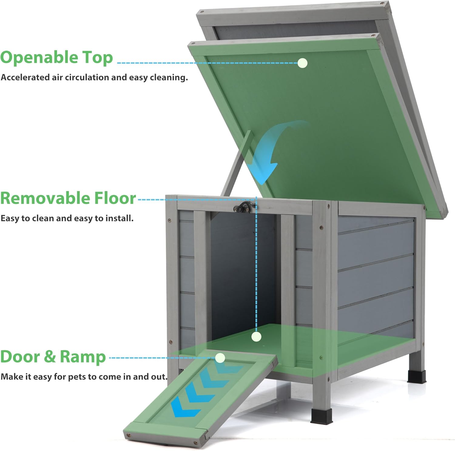 - Pet Friendly Design: The door can also be used as a ramp, ideal for small animals to access the rabbit shelter, providing them with a safe place to rest and sleep. The roof can also be opened to allow pets to breathe and sunbathe.