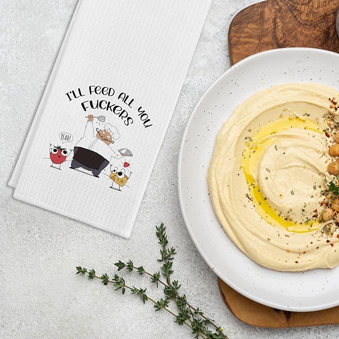 - Unique Design: Our funny kitchen towel with saying "I'll Feed All You Fxxkers". The simple yet cute text patterns can bright up your kitchen and surprise your family and friends. It's a perfect kitchen gift for your favourite chef.
